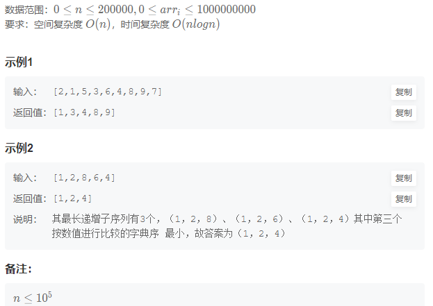 给定数组 arr ,设长度为 n ,输出 arr 的最长上升子序列。(如果有多个答案,请输出其中 按数值(注:区别于按单个字符的ASCII码值)进行比较的 字典序最小的那个)