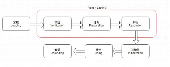 类从被加载到虚拟机内存中开始,到卸载出内存为止,它的整个生命周期包括:加载、验证、准备、解析、初始化、使用、卸载7个阶段,验证、准备、解析3个部分统称为连接