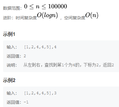 给定一个 元素有序的(升序)长度为n的整型数组 nums 和一个目标值 target ,写一个函数搜索 nums 中的第一个出现的target,如果目标值存在返回下标,否则返回 -1