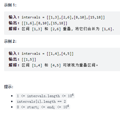 以数组 intervals 表示若干个区间的集合,其中单个区间为 intervals[i] = [starti, endi] 。请你合并所有重叠的区间,并返回一个不重叠的区间数组,该数组需恰好覆盖输入中的所有区间。