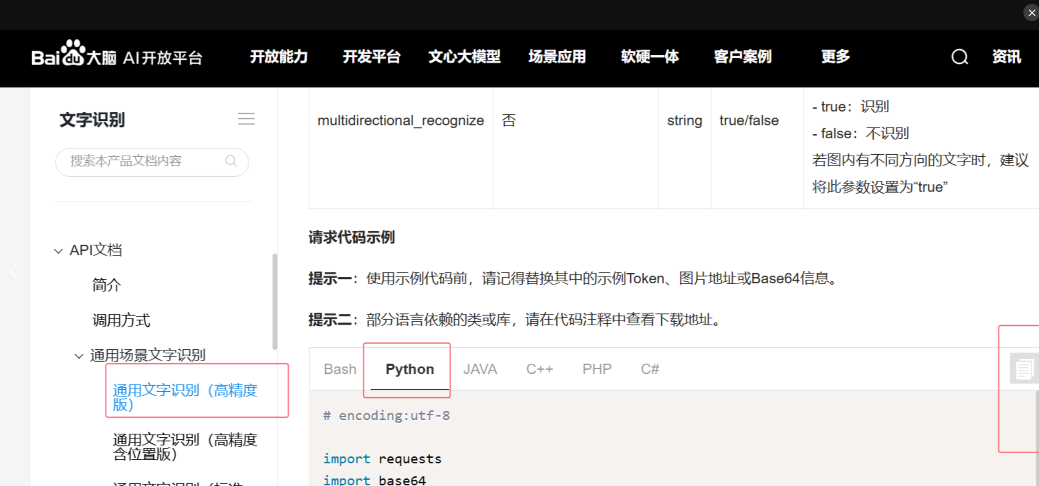 (1)、完成以上步骤后,再次打开百度AI开放平台文字识别OCR,找到API文档->通用场景文字识别->通用文字识别(高精度版),直接拉到下面复制代码到pycharm中;