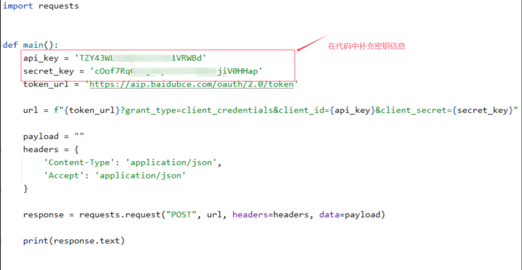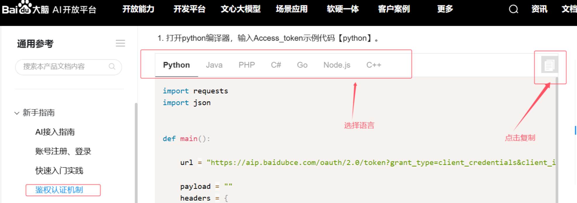(1)、获取后,进入百度AI开放平台获取token。直接打开链接通用参考 - 鉴权认证机制 | 百度AI开放平台,选择新手指南->鉴权认证机制,里面有很多方法可以获取token,这里用的是第一种方法,既复制代码到pycharm里运行: