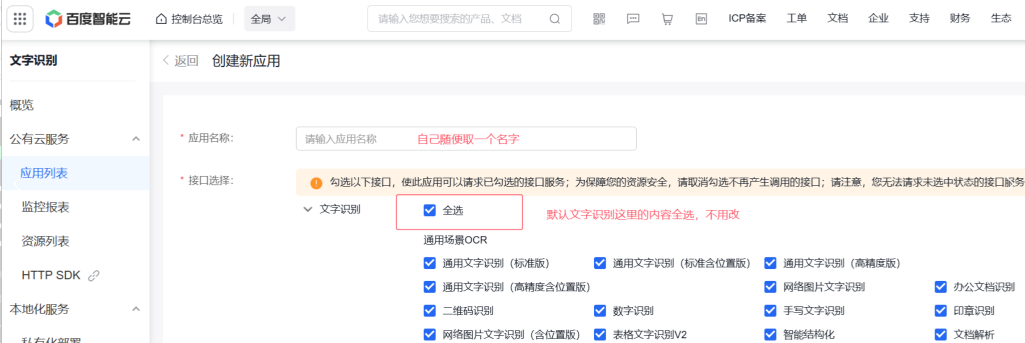 (4)、在公有云服务下点击应用列表-创建新应用。应用名称和应用描述随便写,接口选择默认文字识别全选即可。