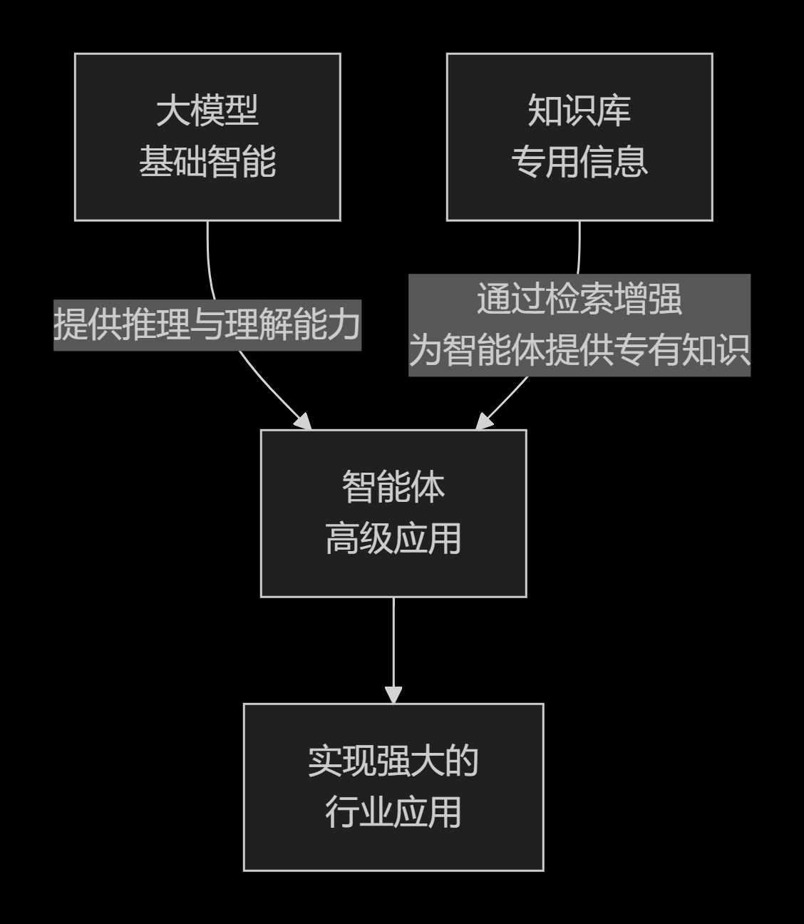 工作流程:用户提问 -> 去知识库中检索最相关的信息 -> 将问题和检索到的信息一起交给大模型 -> 大模型生成一个专业、准确的回答。