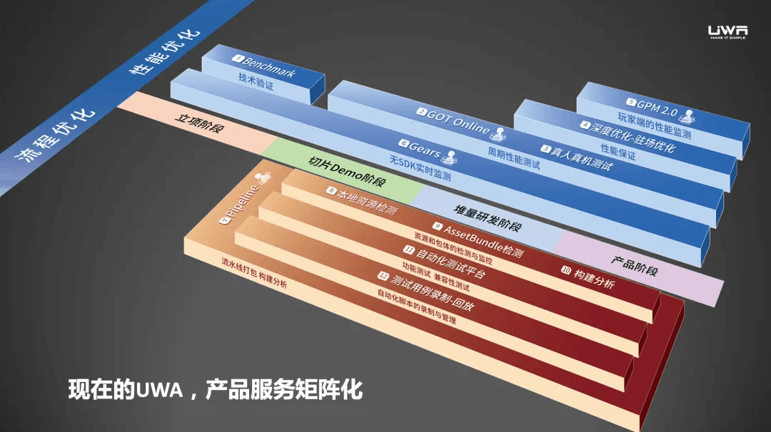 然而,十年后的今天,UWA不仅活了下来,还成为了游戏行业性能优化领域的标杆品牌。从最初的“驻场深度优化”单一服务,到如今覆盖性能分析、自动化测试、线上监控的全套解决方案;从32款测试项目到服务超1万款游戏;从无人知晓到“行业内几乎没有资深程序员没听说过UWA” - 这十年,是UWA的成长史,也是与无数开发者并肩前行的故事。