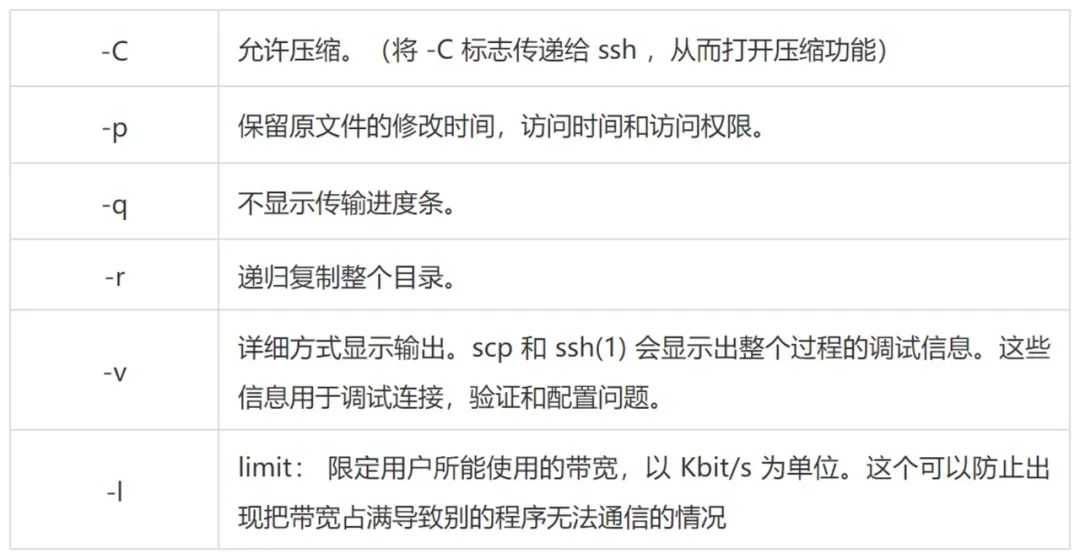 - scp命令有很多可以使用的参数,下面我们列几个常见的参数: