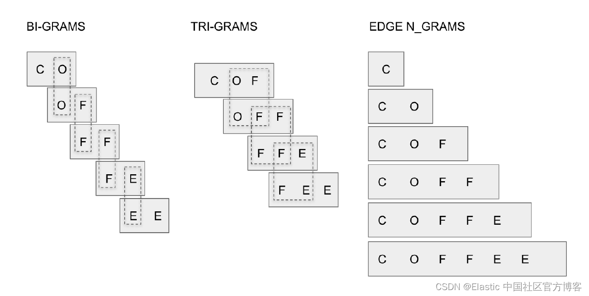 使用此分析器时,需要设置两种不同的大小:一种指定要生成的最小 ngrams(min_gram 设置),另一种指定要生成的最大 ngrams。 使用前面的示例,如果你指定 min_gram 为 2 且 max_gram 为 3,则你将获得前两个示例中的组合分词: