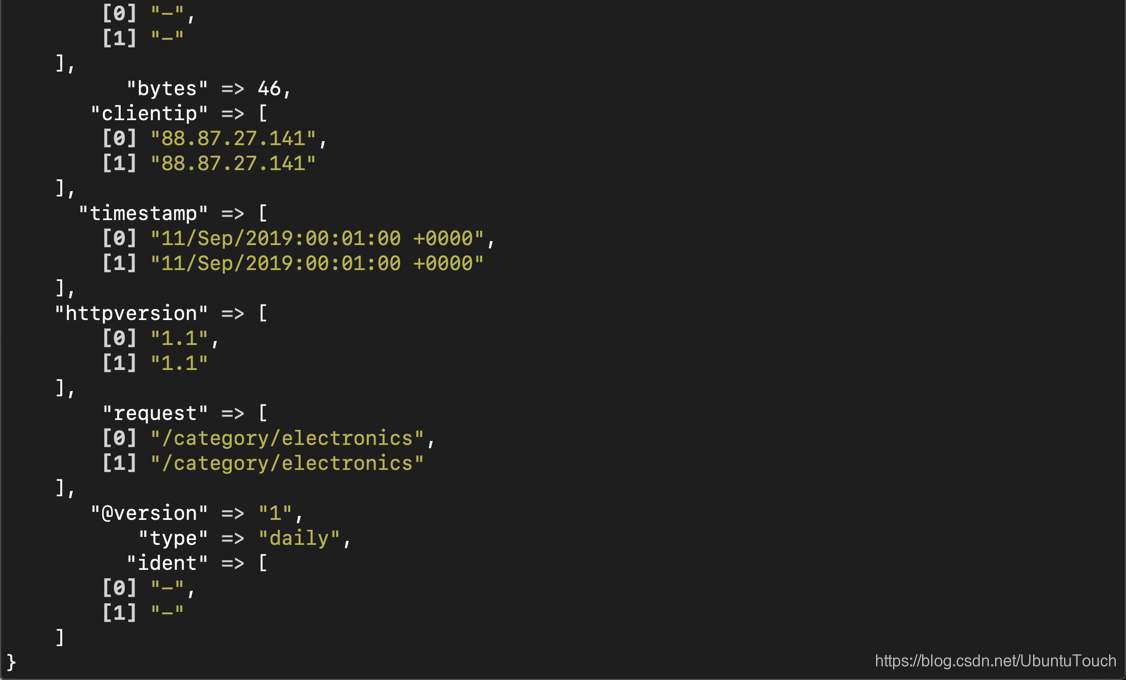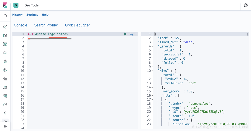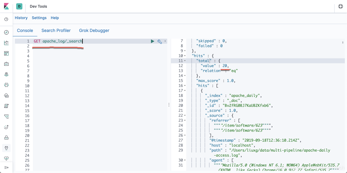 我们可以看到在 apache_log 里有20条数据,它包括两个 log 文件里所有的事件,这是因为它们都是一个 pipleline。同样我们可以在 apache_daily 看到同样的20条数据。