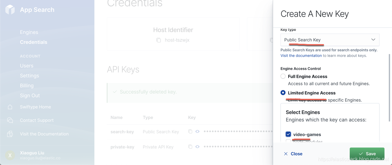 使用仅对 video-games 引擎具有 Limited Engine Access 的方式创建新的 Public Search Key。