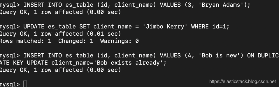 MySQL 中的更新/插入 (upsert) 可通过下列命令完成,您可以验证正确信息是否会反映在 Elasticsearch 中: