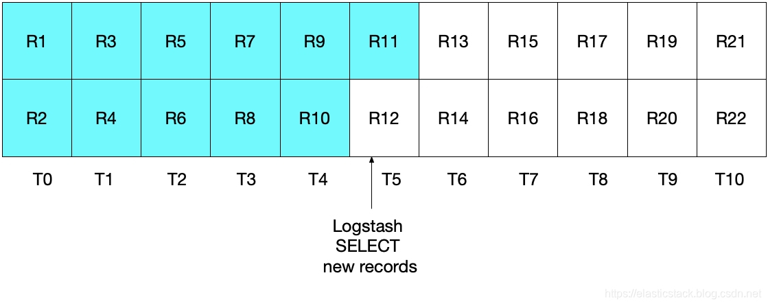 在上述 SELECT 语句的下一个迭代中,我们仅会提取时间晚于 T5 的文档(因为 WHERE (UNIX_TIMESTAMP(modification_time) > :sql_last_value) 就是如此规定的),这也就意味着将会跳过记录 R12。您可以参看下面的图表,其中蓝绿色方框表示 Logstash 在当前迭代中读取的记录,灰色方框表示 Logstash 之前读取的记录。