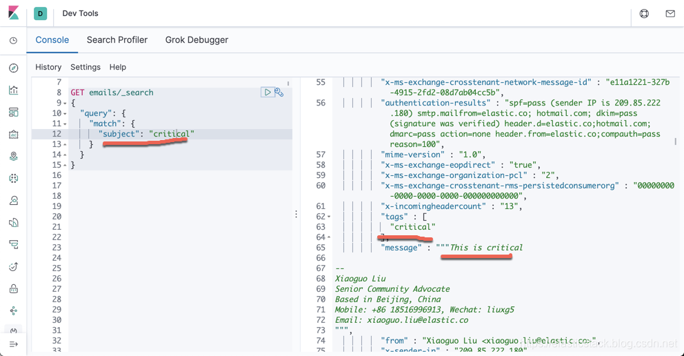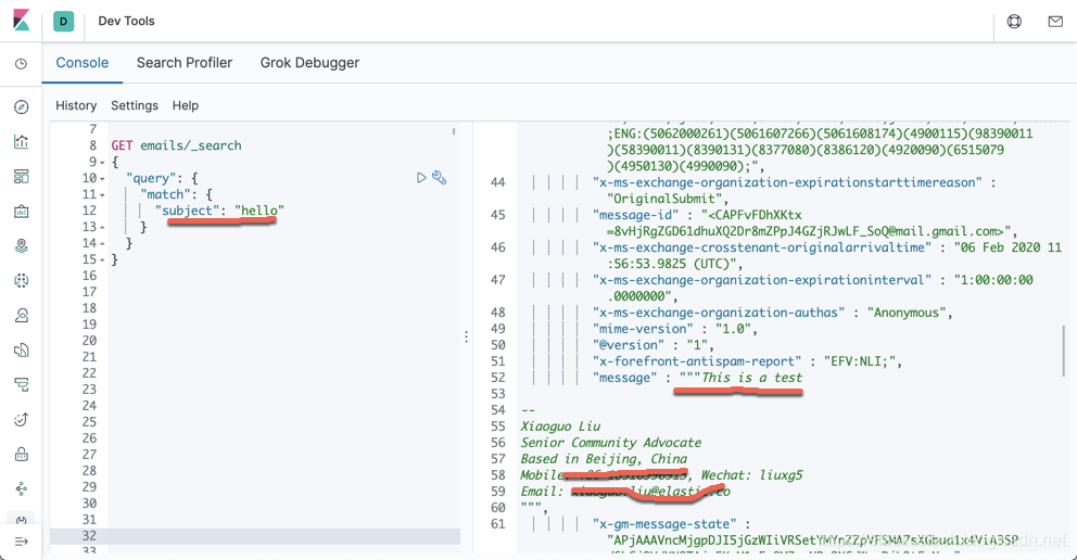 可以发现,我们已经成功地把发向 hotmail 的邮件导入到 Elasticsearch 中了。