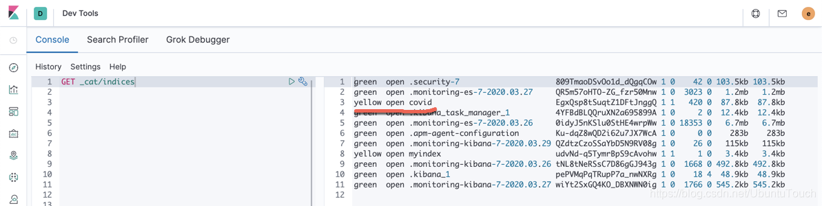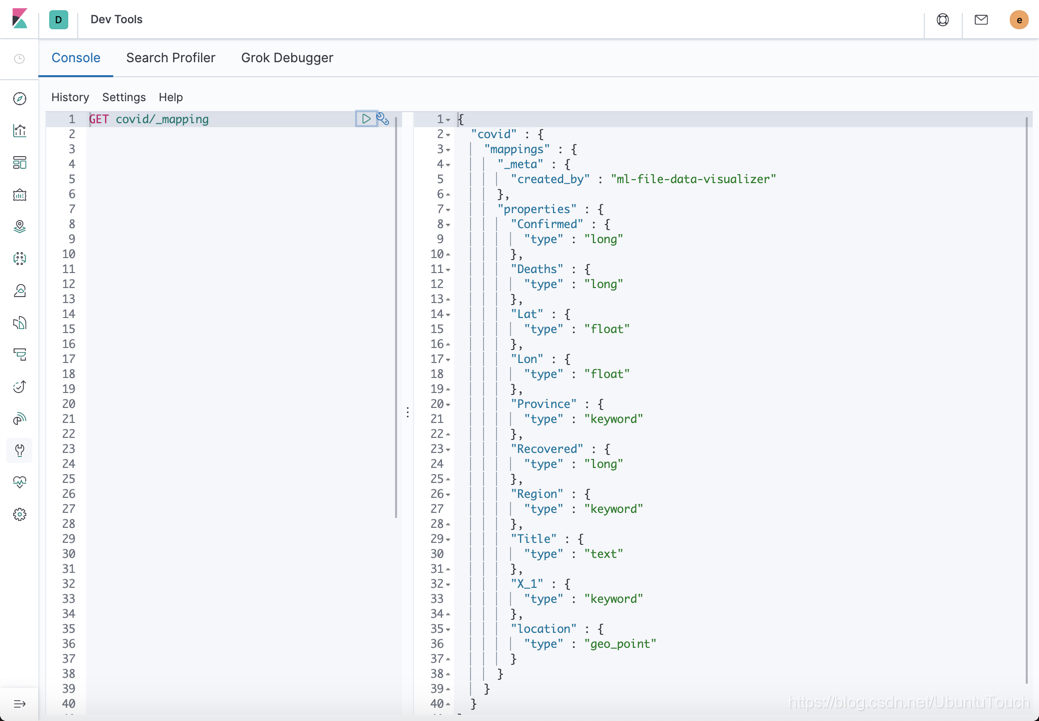 我们可以看见新生成的叫做 covid 的一个索引。我们再来查看一下它的 mapping: