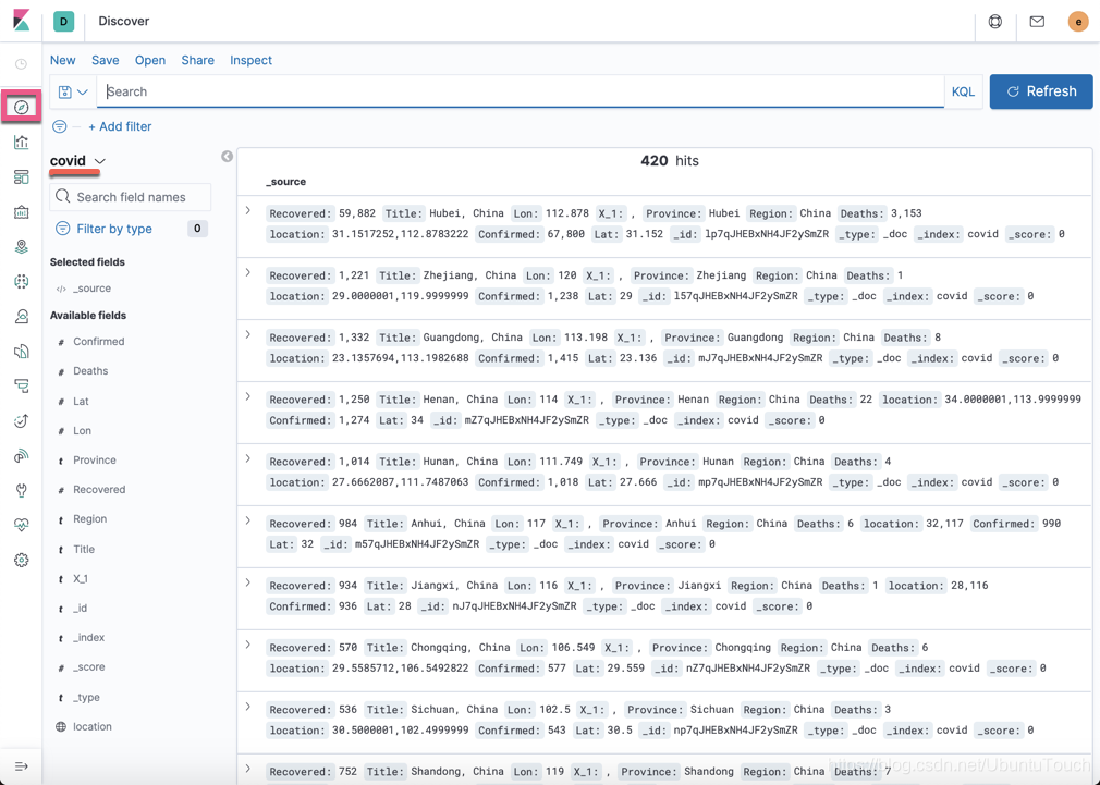 在 Kibana 的 Discover中,我们也可以查看到所有的数据: