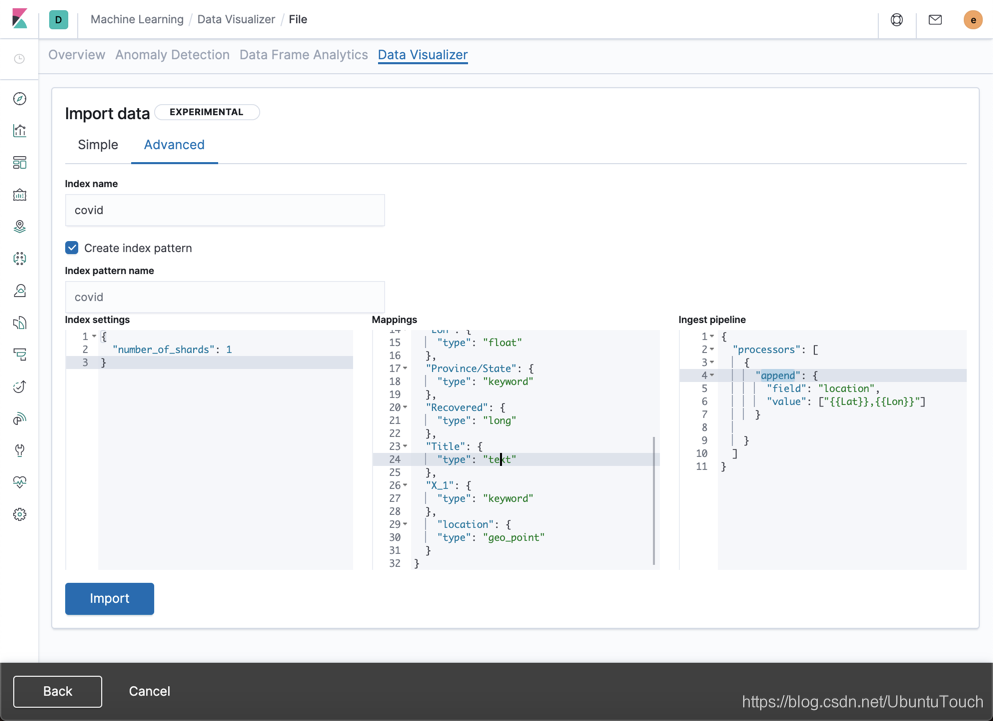 本文详述了如何使用Kibana的DataVisualizer功能导入COVID-19数据,并通过定制索引映射和处理器,包括添加地理位置字段和时间戳,实现数据的高效存储与分析。