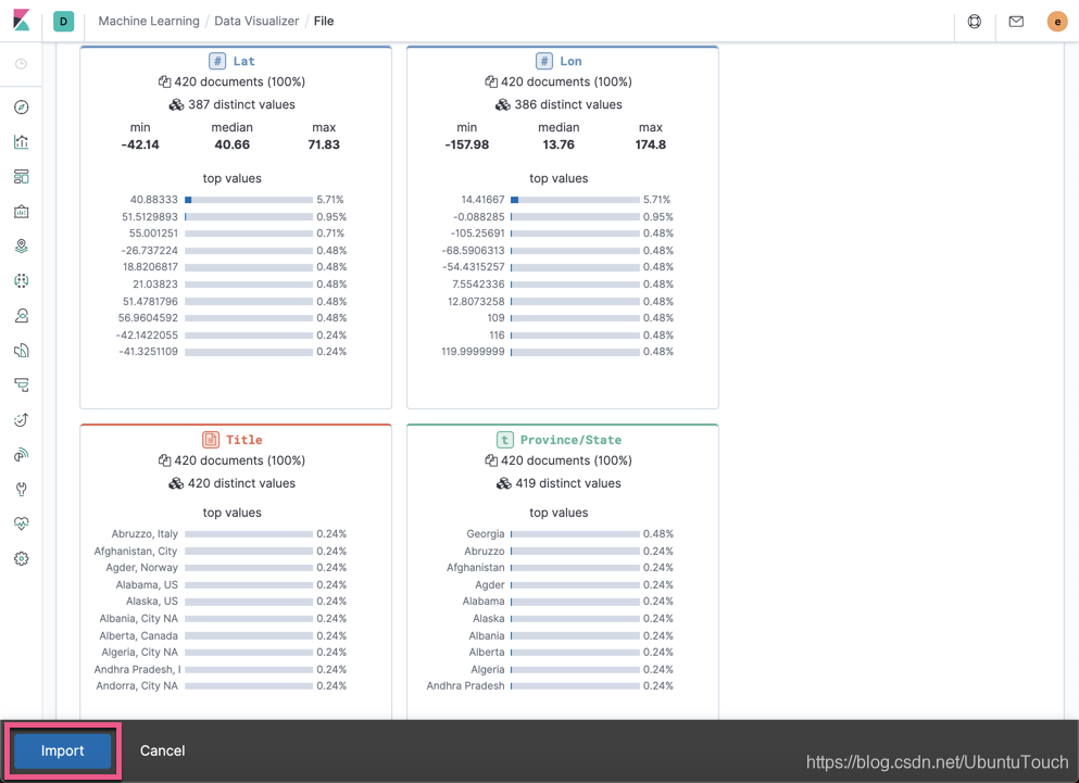 在上面我们可以看到被导入的所有的文档,也可以看到 Elastic 利用机器学习对数据的分析及统计情况: