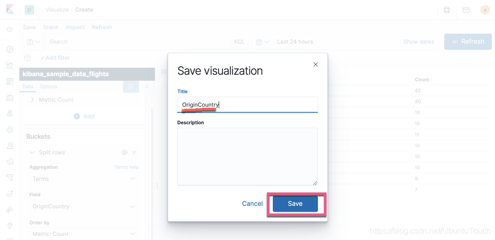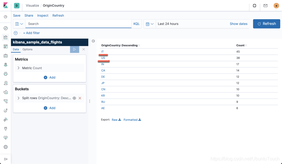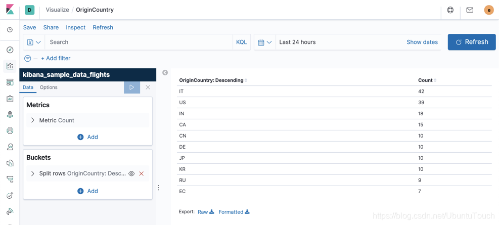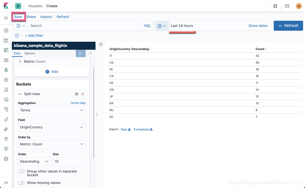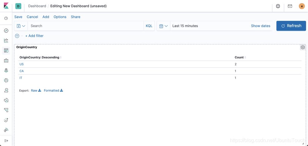 按照上面的选择,我们生成一个我们需要的table:在左边显示 OriginCountry,在右边显示相对应的文档的数量。我们点击 Save 来保存当前的 Visualization。可以看出来:在左边的 OriginCountry 里,并没有超链接。