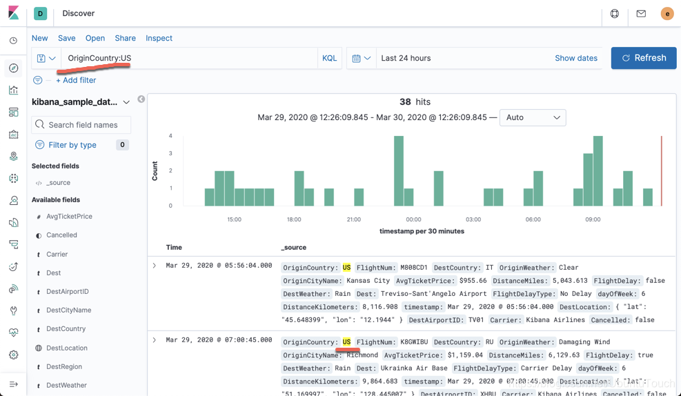 我们可以看到在 Discover 的页面变成了搜索 OriginalCountry:US 的查询结果。我们甚至可以看到之前显示的38个文档。
