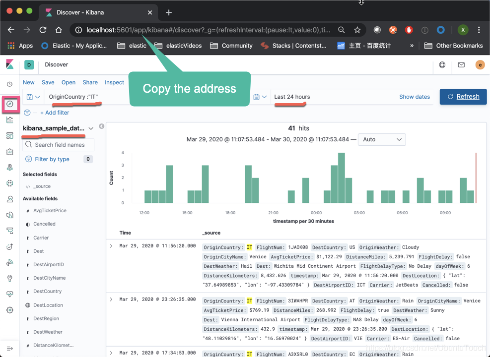 我们在 Search bar 里输入 OriginCountry: "IT"。在上面我们可以看出来所有的 OriginCountry 为 IT 的所有的文档。我们拷贝在浏览器中的地址(所有的字符串)。