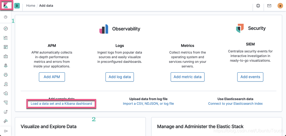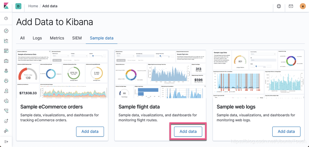 点击 Add data,这样我们就可以把 Sample flight data 导入到 Elasticsearch 中。