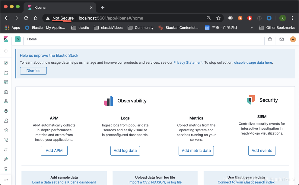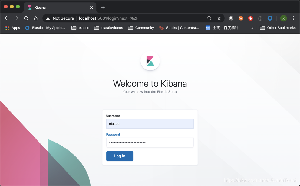 在一个 terminal 中打入上面的命令。然后我们在我们的浏览器中输入地址 https://localhost:5601。和上面 Elasticsearch 一样的方法,记得输入上面的用户名 elastic 及获得的密码: