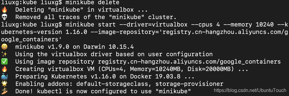 $ minikube start --driver=virtualbox --cpus 4 --memory 10240 --kubernetes-version 1.16.0 --image-repository='registry.cn-hangzhou.aliyuncs.com/google_containers'