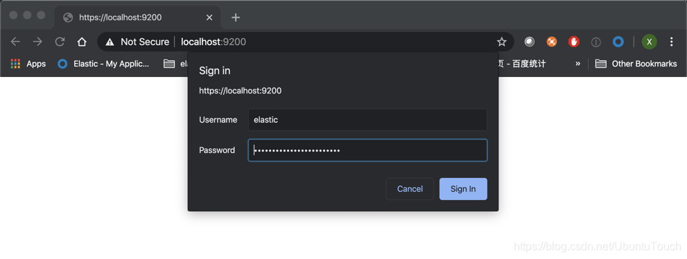 上面显示我们的 Elasticsearch 是正常运行的。我们也可以在我们的 Chrome 浏览器中,打入地址 https://localhost:9200/。我们可以看到如下的画面: