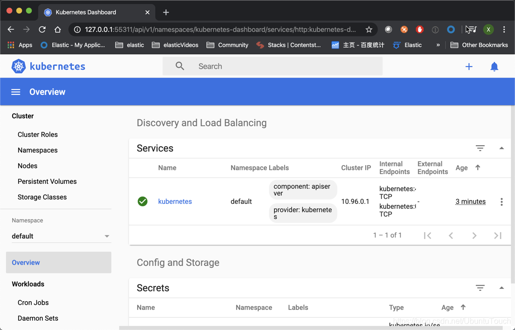 当上面的命令执行后,它就会启动一个 web 的接口让我们来对 kubernetes 监控和管理:
