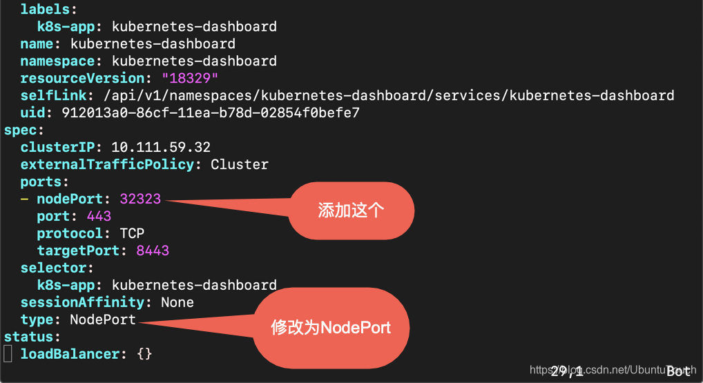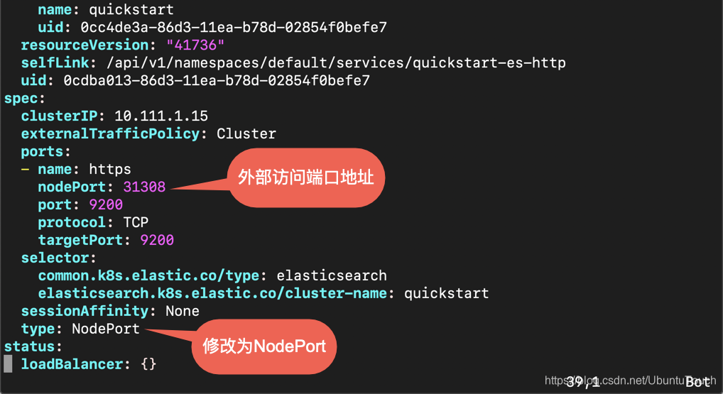 上面显示 quickstart-es-http 是一个 ClusterIP 的服务。我们想把它改为 NodePort 的服务: