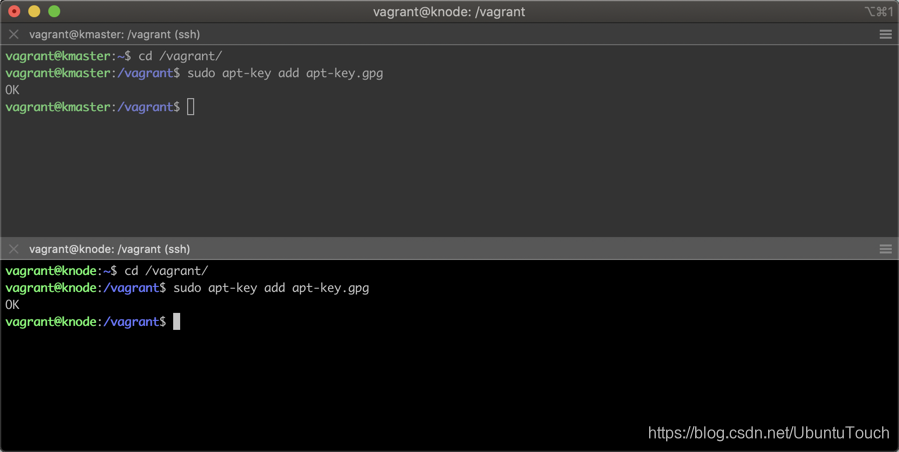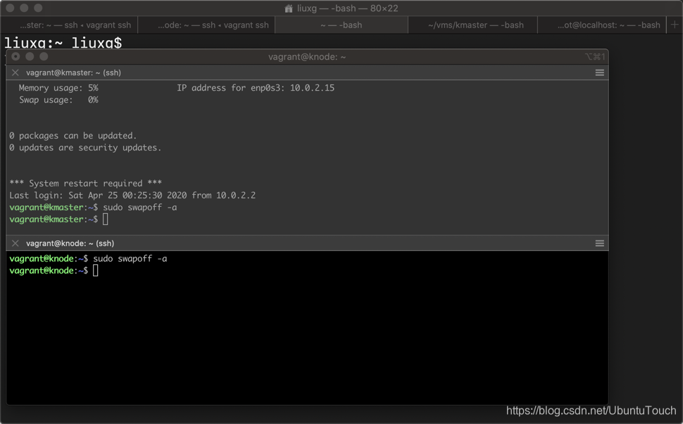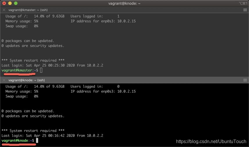 这样我们的两个 Ubuntu 18.04 的 VM 就启动起来了。我们接着分别登陆这两个 VM。在 kmaster 及 knode 的目录下,打入如下的指令: