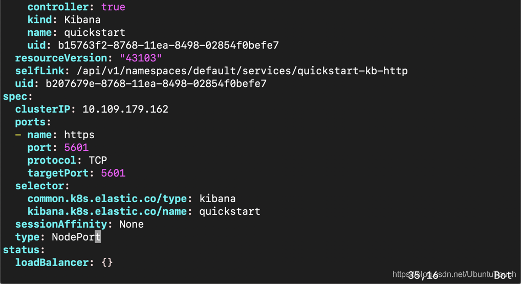 quickstart-kb-http NodePort 10.109.179.162 <none> 5601:31675/TCP 12m