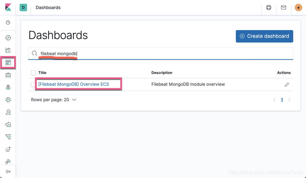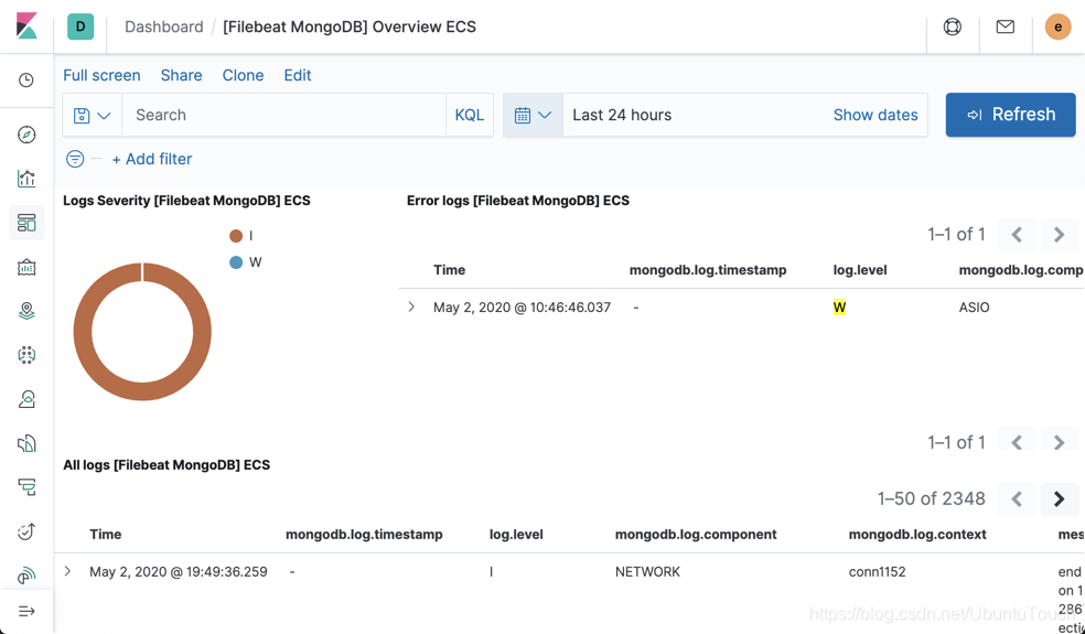 Filebeat 还带有导入到 Kibana 的预构建仪表板,请转到 Dashboard,你应该有很多 Filebeat 仪表板可用。 我们启用了mongodb 模块,因此仪表板 “[Filebeat MongoDB] Overview ECS”。 它基于日志(错误率)概述了 MongoDB 的状态。