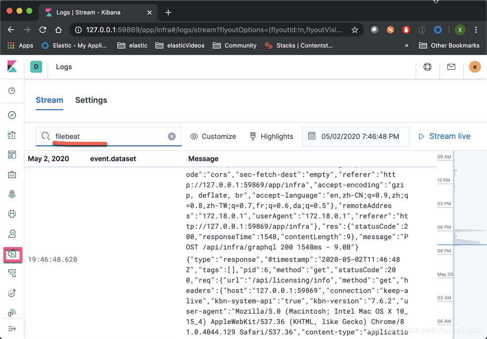 等到filebeat pod 正在运行,你应该能够观察Kibana中的日志。