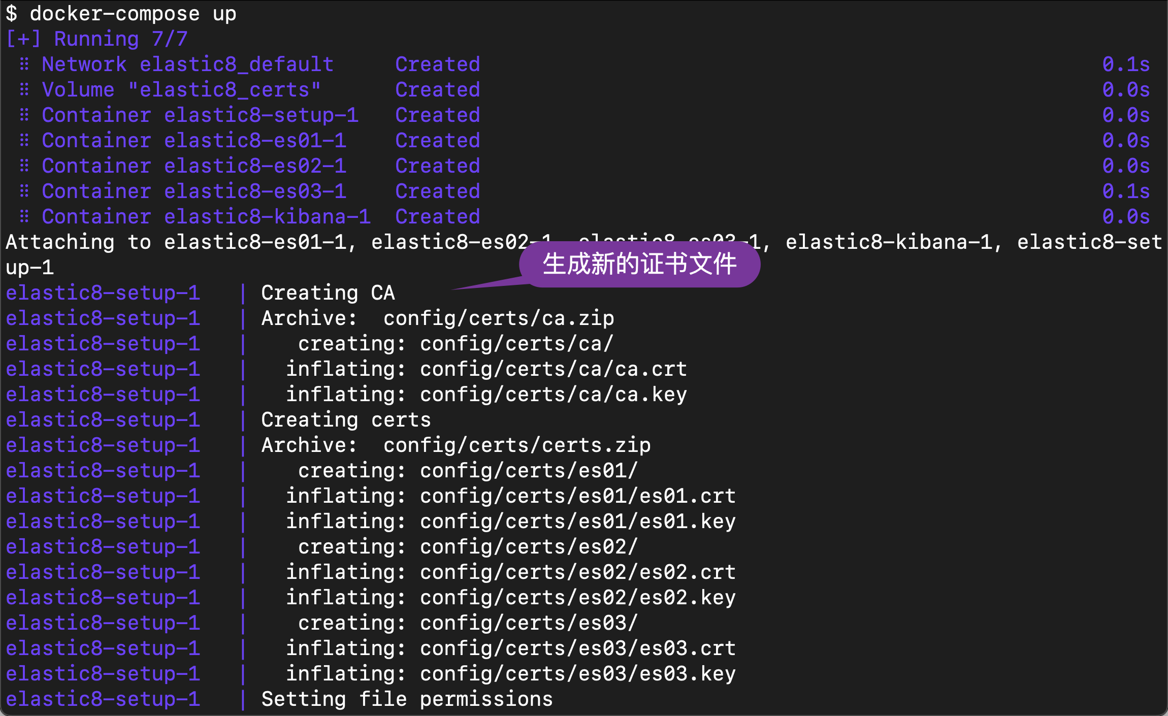 bin/elasticsearch-certutil cert --silent --pem -out config/certs/certs.zip --in config/certs/instances.yml --ca-cert config/certs/ca/ca.crt --ca-key config/certs/ca/ca.key;