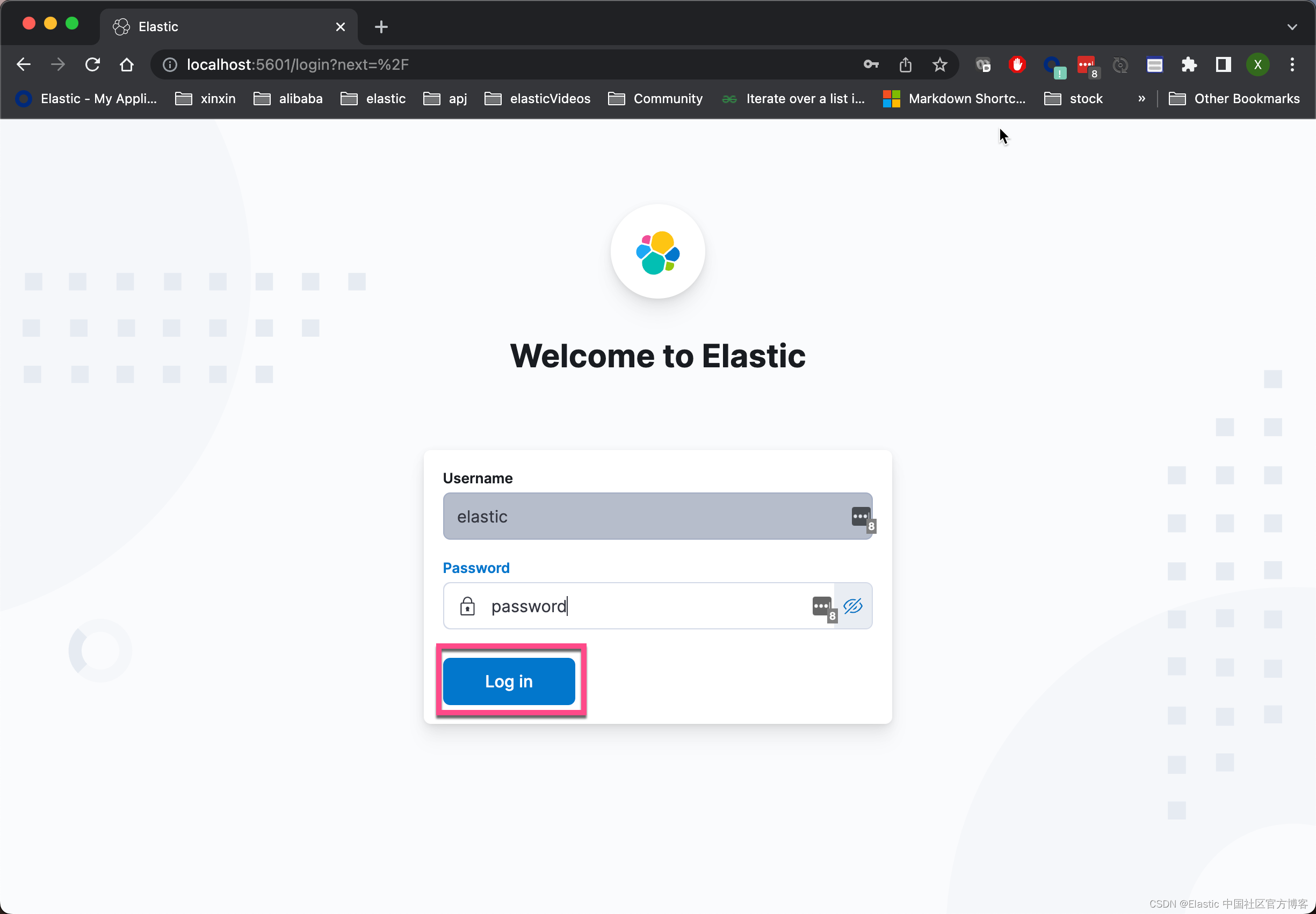 还记得我们之前设置的 elastic 用户的密码吗?我们填入密码,并登录: