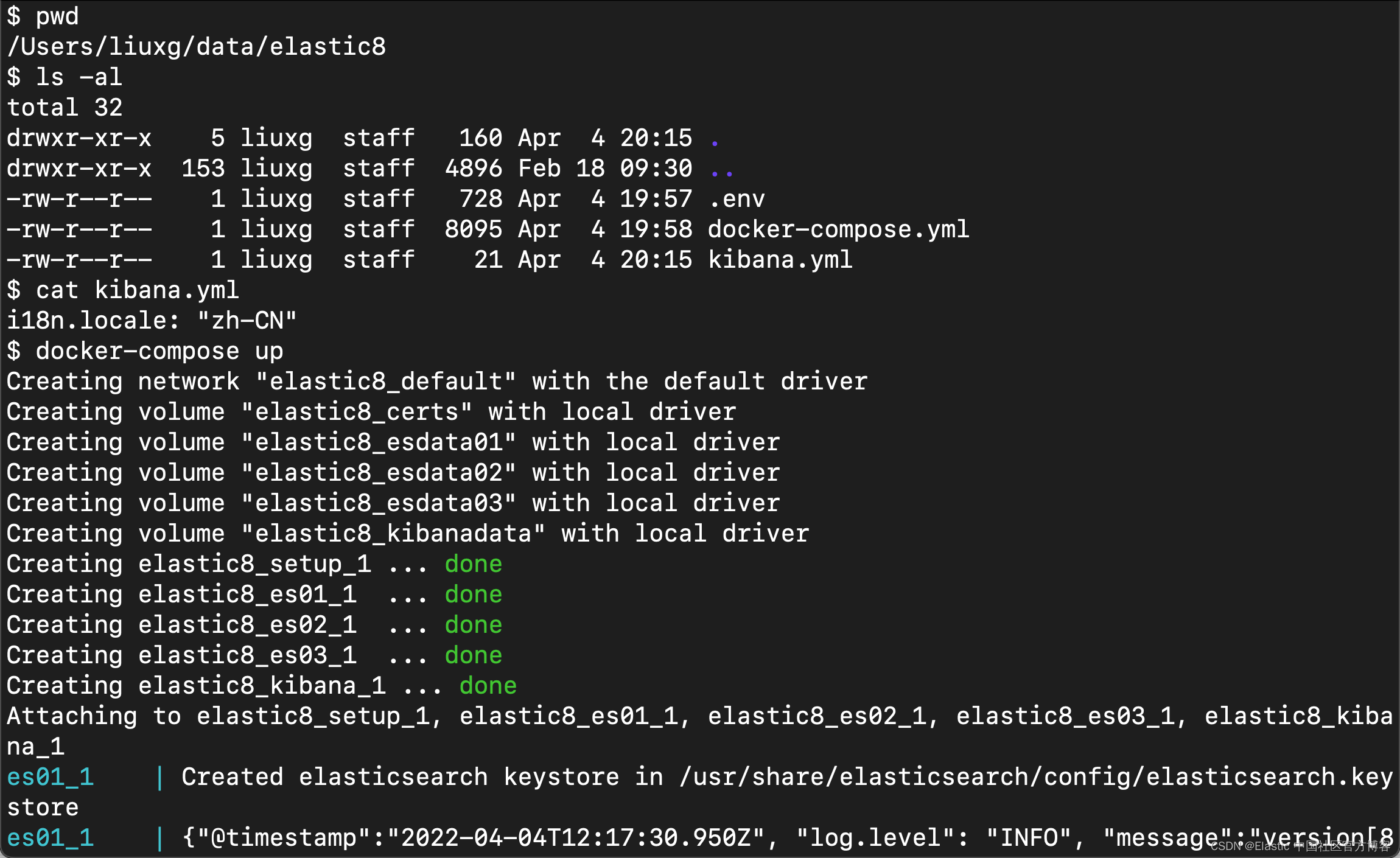 通过使用 Docker compose 的方法,它提供了一种启动安全集群的简单方法,你可以在构建具有多个主机的分布式部署之前将其用于开发。关于构建多个主机分布式部署,你可以参阅我的另外一篇文章 “Elasticsearch:在多个机器上创建多节点的 Elasticsearch 集群 - Elastic Stack 8.0”。