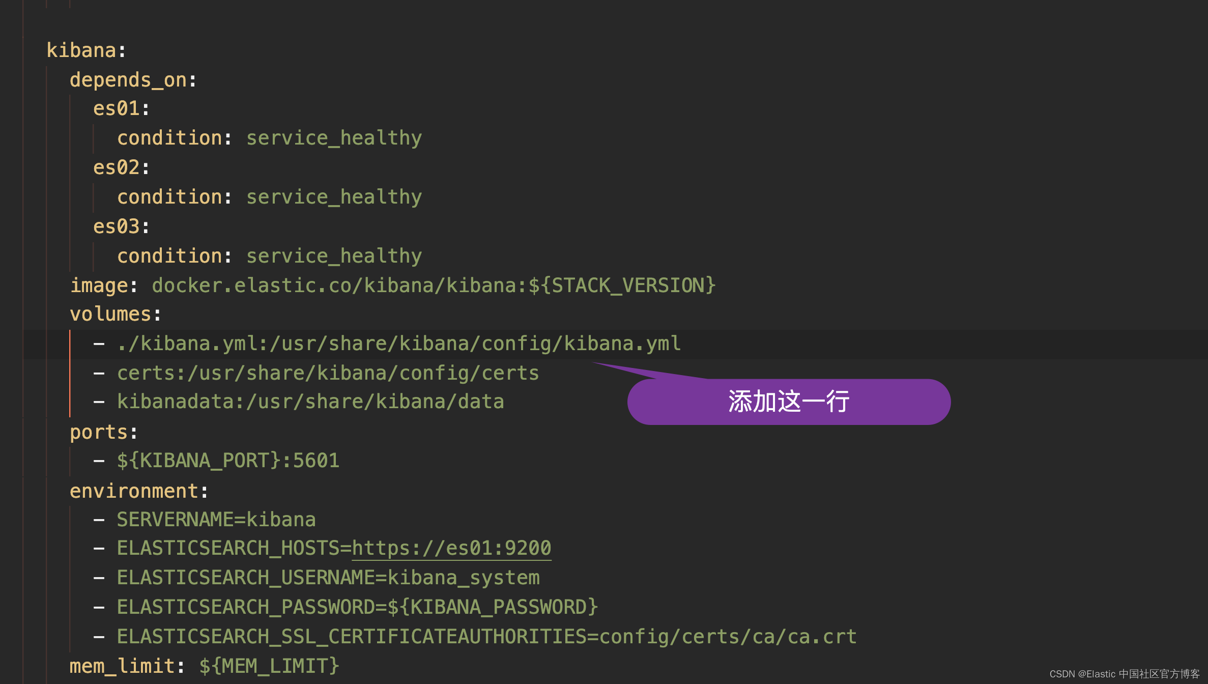 例如,要将自定义 es01.yml 用作 es01 Elasticsearch 节点的配置文件,你可以在 es01 服务的卷部分创建绑定挂载。