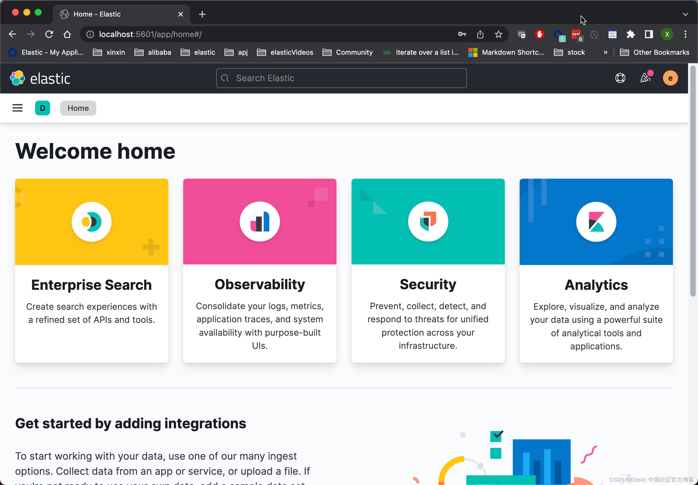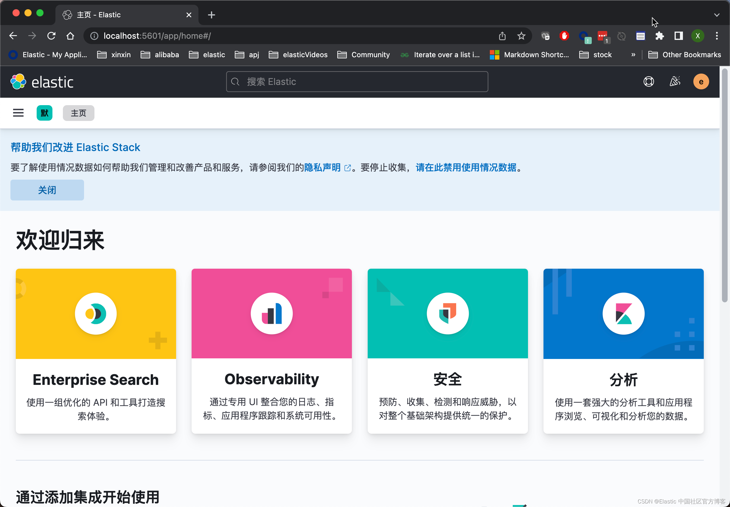 等所有的容器都起来后,我们再次在浏览器中打入 http://localhost:5601: