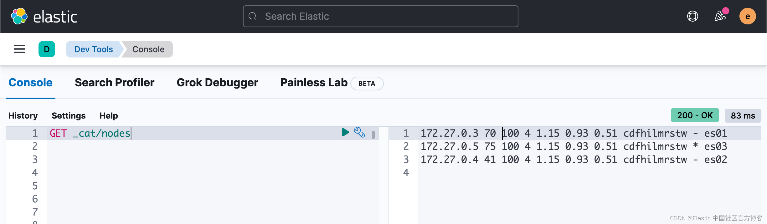 这样我们就进入到 Kibana 了。我们在 Kibana 中打入如下的命令来检查一下节点的数量: