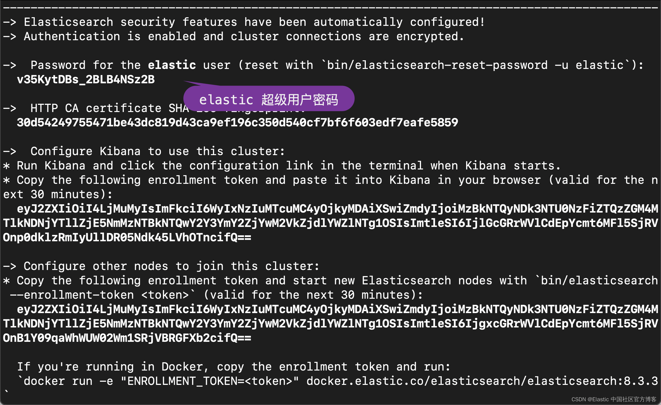 在启动的过程中,我们可以看到 elastic 用户的密码及其他信息: