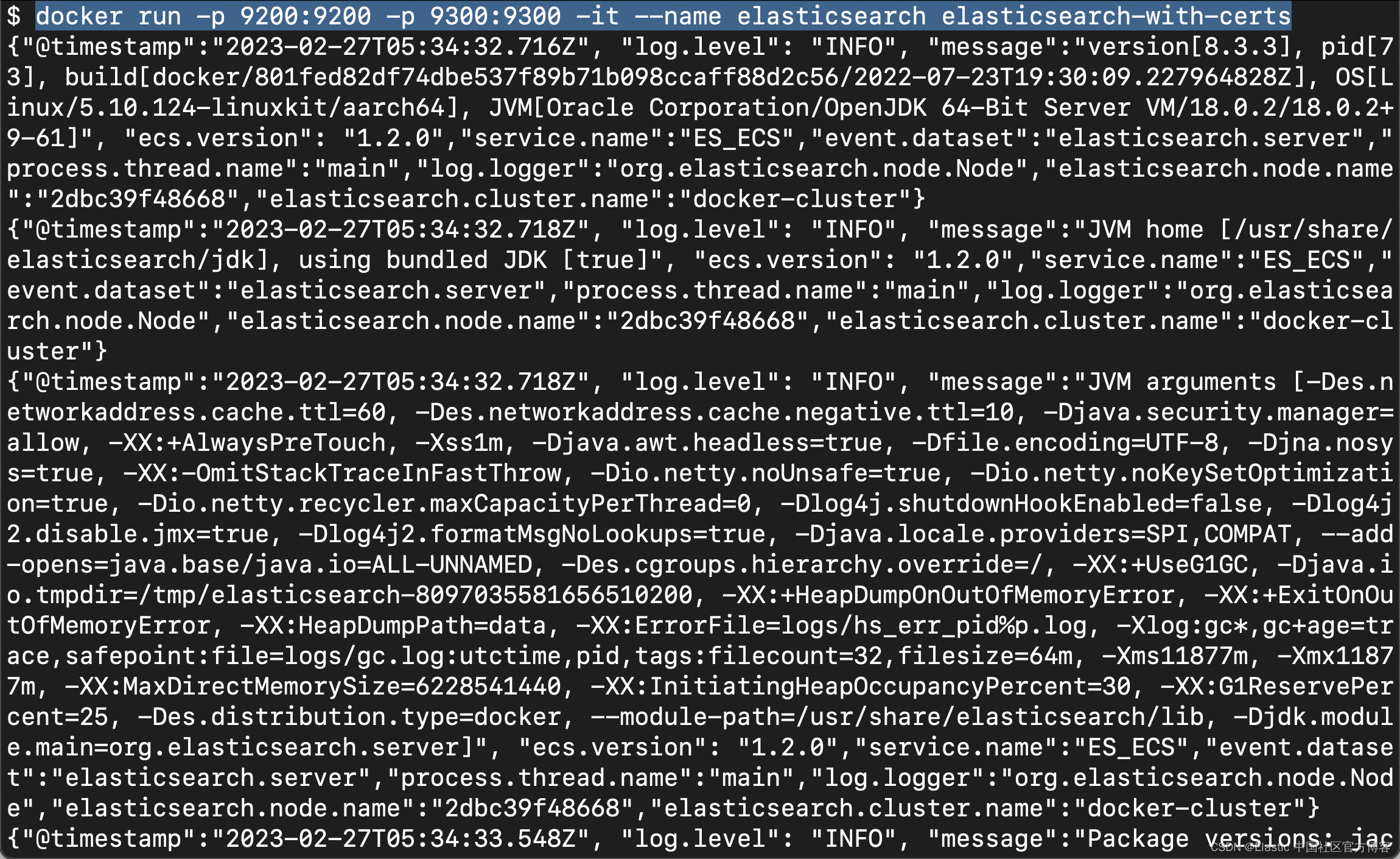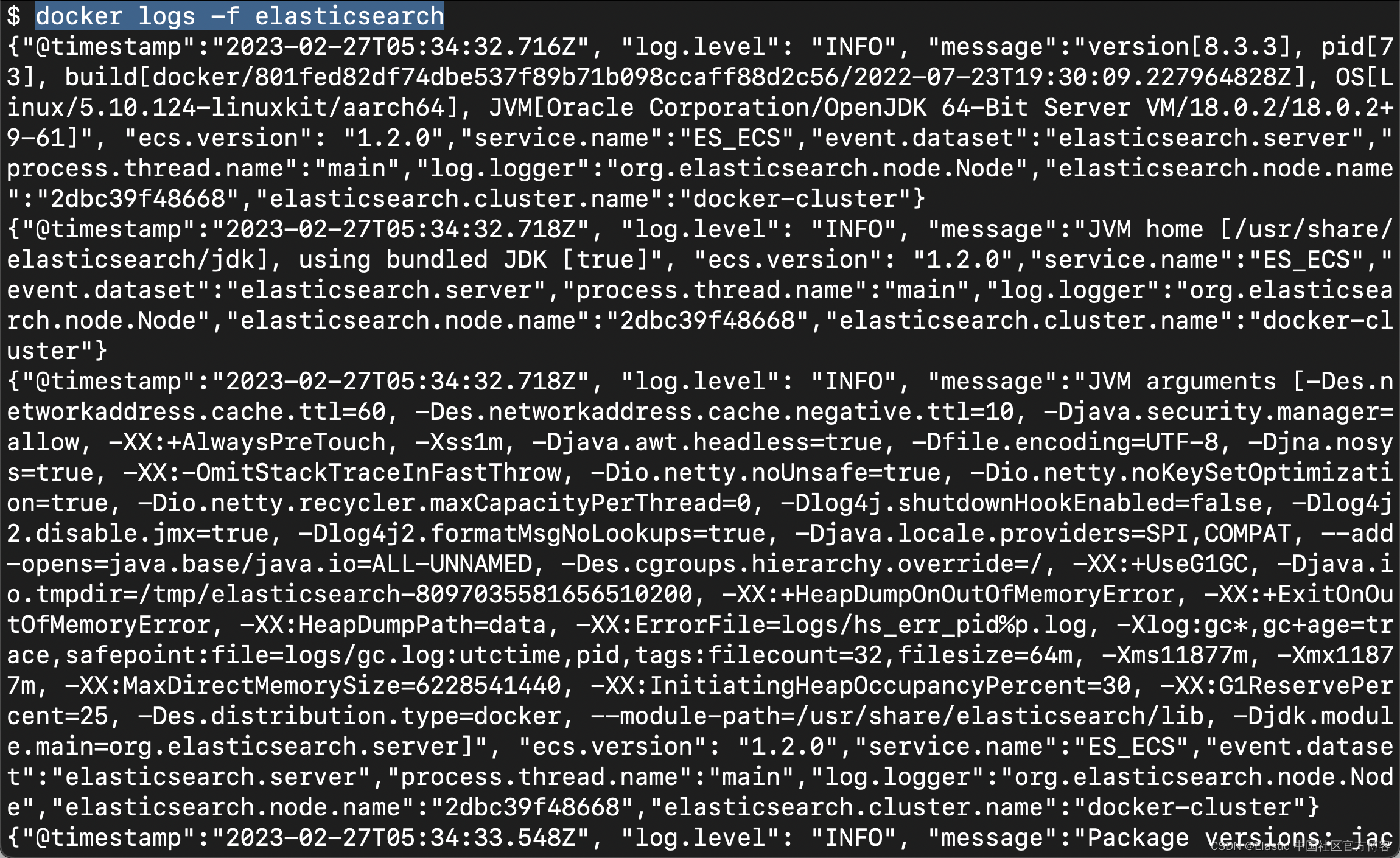 我们可以通过如下的命令来查看 elasticsearch 容器的日志信息: