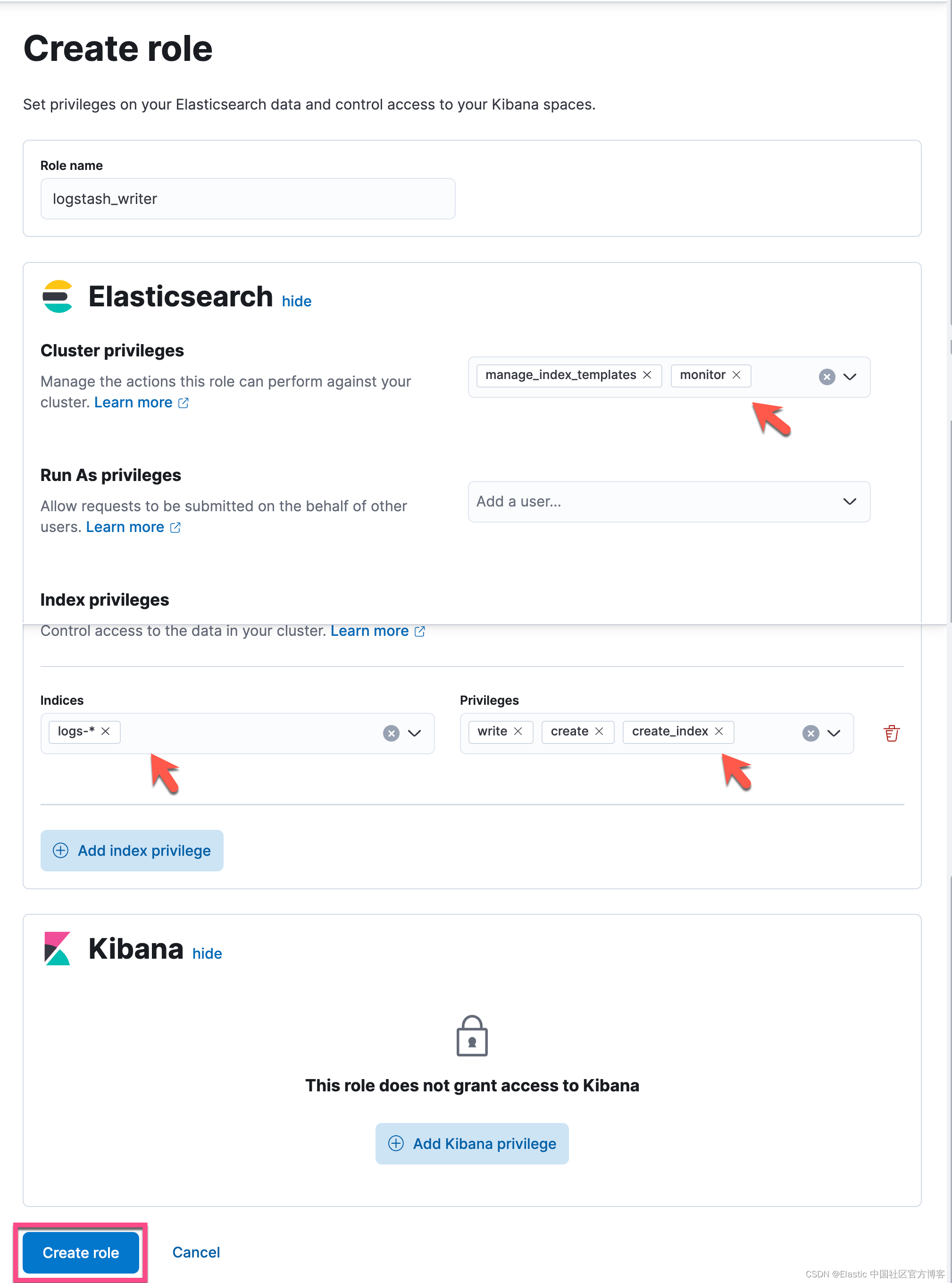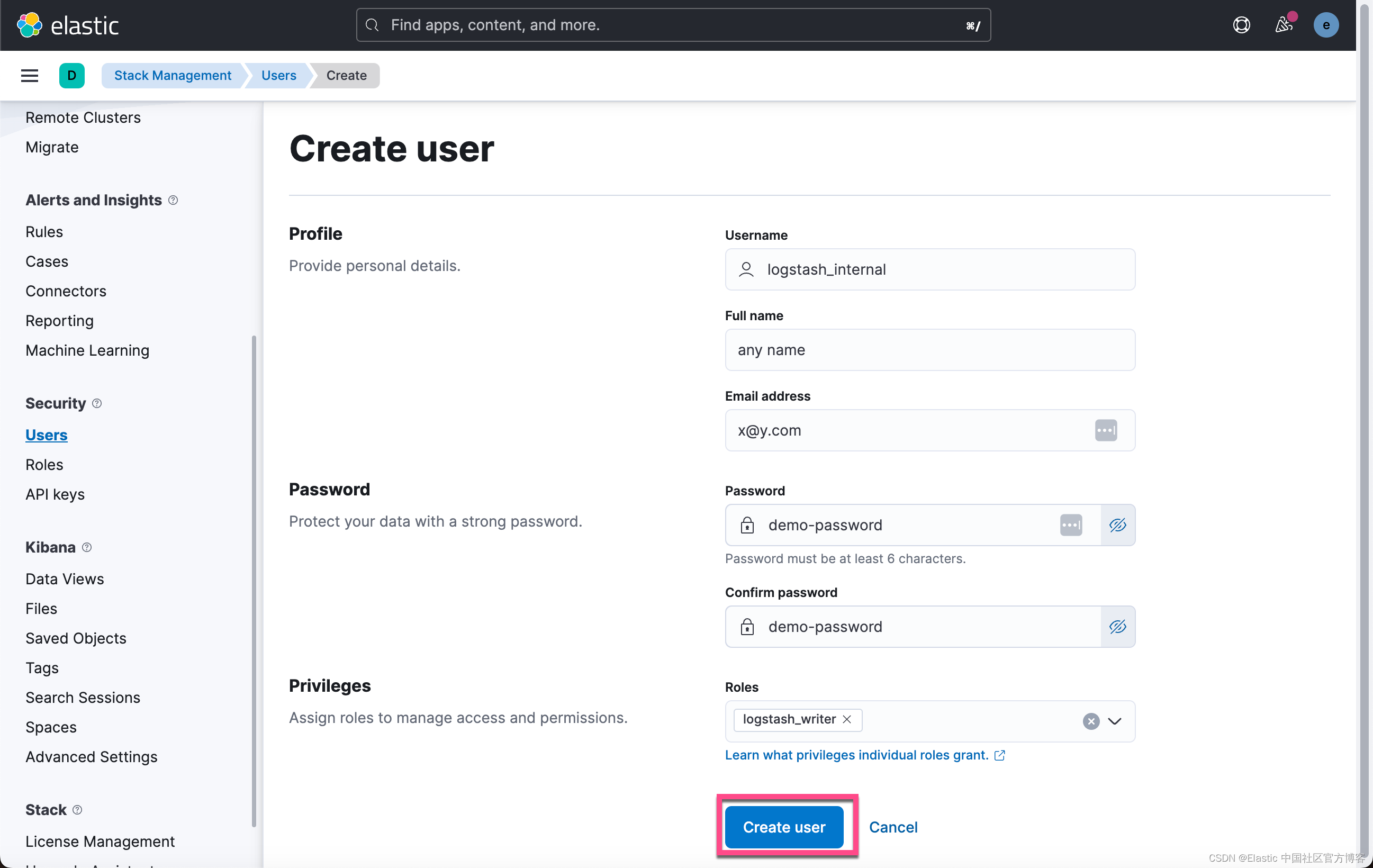 接下来,导航到用户 UI,创建一个名为 logstash_internal 的新用户并为其分配 logstash_writer 角色。 对于本教程,我们将为用户使用密码 “demo-password”。