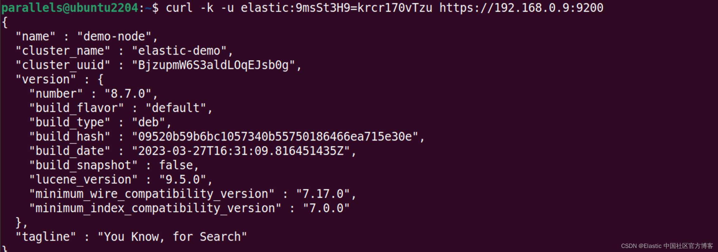 如果我们能看到上面的输出就证明我们的 Elasticsearch 的安装是正确的。在上面,我们使用了 -k 来忽略自签名证书。完整的命令为: