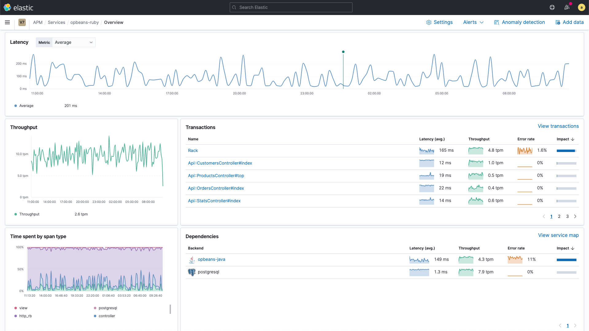 此外,APM 还可以让你查看关键性能指标的历史和趋势,例如延迟和吞吐量,以及 transaction 和依赖信息: