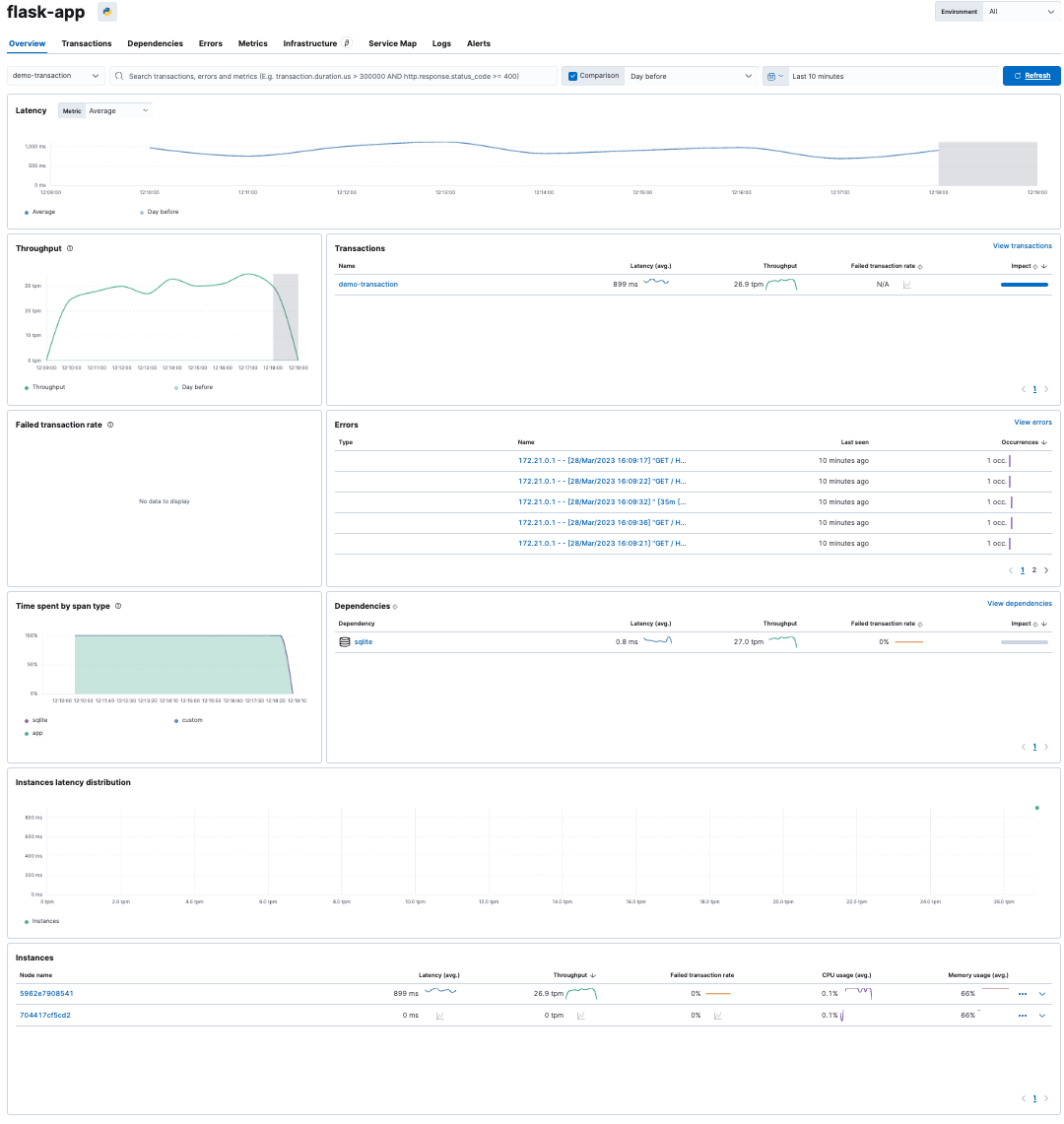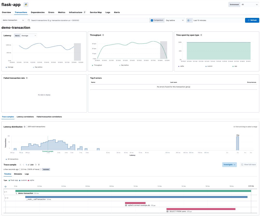 此视图提供了在指定时间段(在本例中为过去 15 分钟)内已将应用程序跟踪数据发送到 Elastic APM 的所有应用程序的列表。 还有迷你图显示延迟、吞吐量和错误率的迷你图。 单击 flask-app 将我们带到 service overview 页面,该页面显示了服务中的各种 transaction(回想一下我的脚本正在访问 / 端点,如 Transactions 部分所示)。 我们得到了更大的延迟、吞吐量、错误和错误率图表。