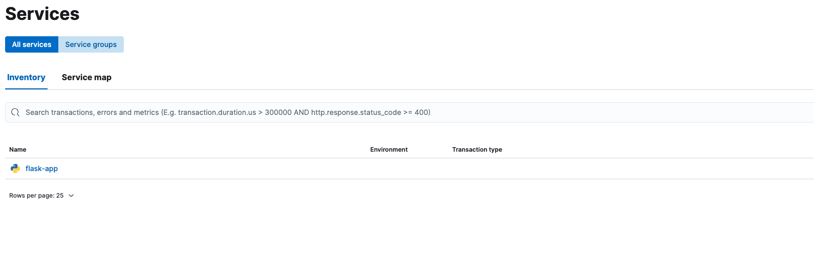 回到 Kibana,导航回 APM 应用程序(汉堡包图标,然后选择 APM),你应该会看到我们新的 flask-app 服务(我让我本地的部署运行,所以它显示了更多的历史记录):