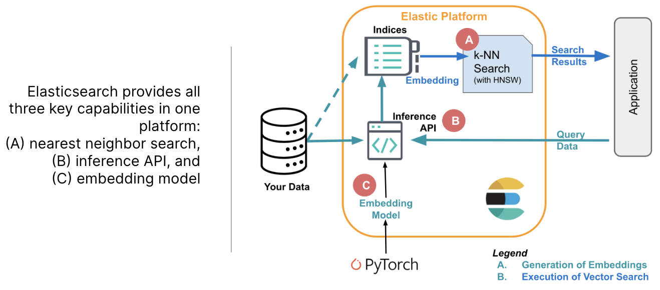 与专用向量数据库相比,Elastic 在单个平台中支持三种功能,这对于实现向量搜索支持的应用程序至关重要:存储嵌入 (A)、有效搜索最近邻居 (B) 以及将文本嵌入到向量表示中 (C) 。