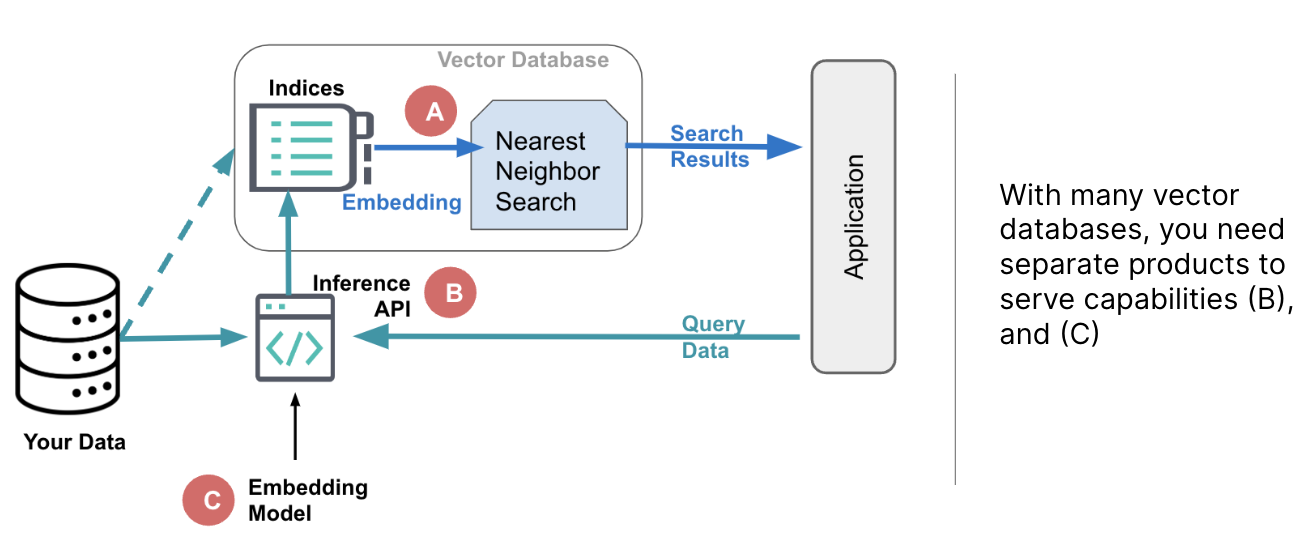 一些向量数据库仅提供存储和搜索嵌入的功能,如上图中的 A 所示。 然而,这种方法给开发人员带来了如何生成这些嵌入的挑战。 通常,这需要访问嵌入模型(显示为 C)和 API 以将其应用到你的数据和查询 (B)。 而且你可能只能存储非常有限的元数据以及嵌入,这使得在用户应用程序中提供全面的信息变得更加复杂。