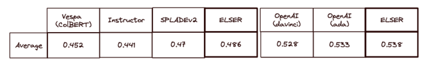 - 一流的检索性能:使用 Elastic 的学习稀疏编码器与 BM25 相结合的混合搜索优于 SPLADE、ColBERT 和 OpenAI 提供的高端嵌入模型。