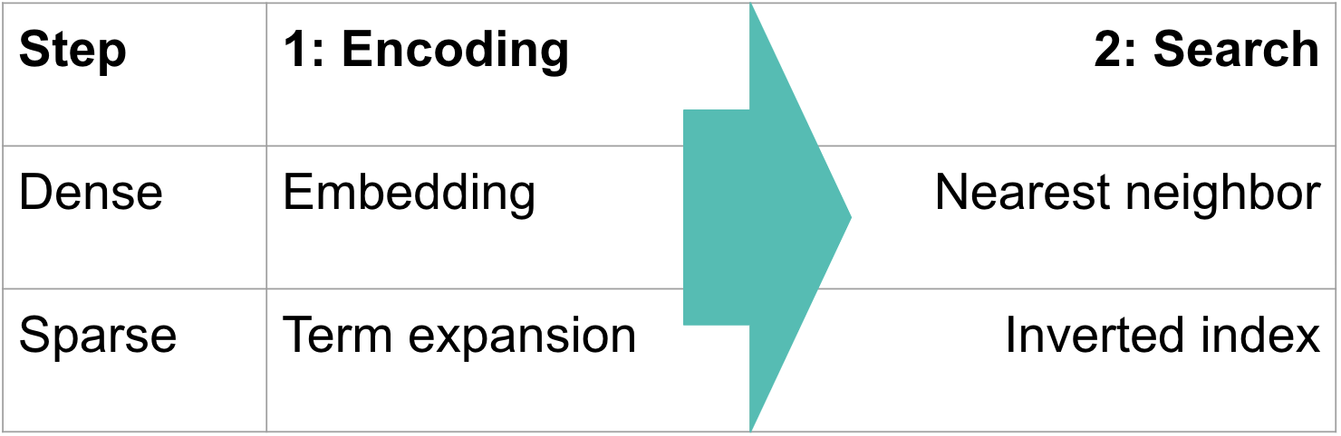 检索方法有两大类,通常称为 “密集(dense)” 和 “稀疏(sparse)”。 两者都使用文本的向量表示形式,对含义和关联进行编码,并且都将搜索紧密匹配作为第二步,如下图所示。 所有基于向量的检索方法都有一个共同点。
